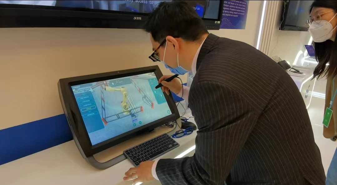 在数字化教育装备应用展示区,戴上智能头盔或眼镜,操作手柄,就可以灵活拆取、检测复杂的机器零部件,利用混合现实头盔和虚仿一体机,学习者轻松地将实验实训课堂“搬”到了现场。